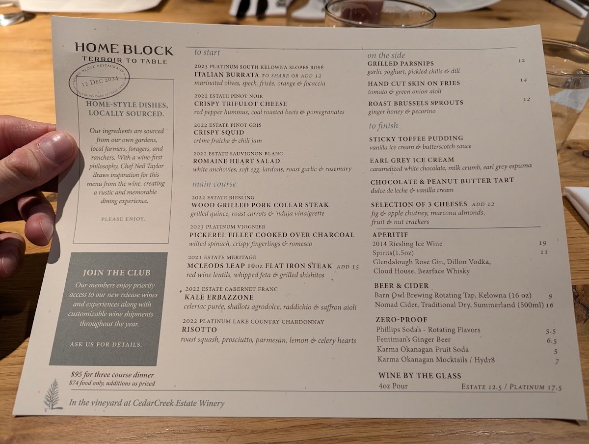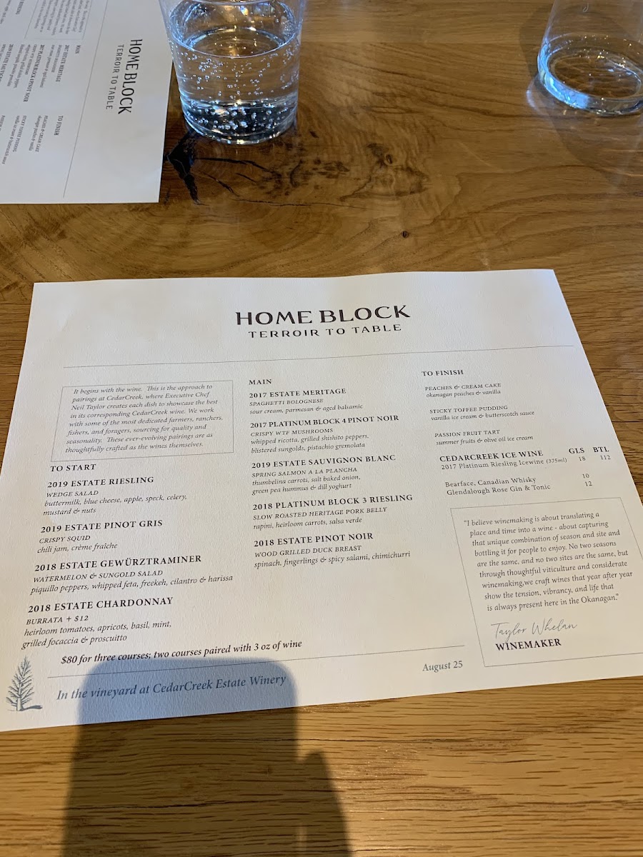 Welcome to Home Block at CedarCreek Estate Winery, where culinary innovation meets breathtaking views. Located in Kelowna, BC, this fine dining gem offers a farm-to-table menu that changes daily, ensuring a fresh experience with every visit. The starters feature delectable options like the Gem Heart Salad with buttermilk and crispy bacon, alongside Crispy Squid paired beautifully with the aromatic 2018 Estate Gewurztraminer.